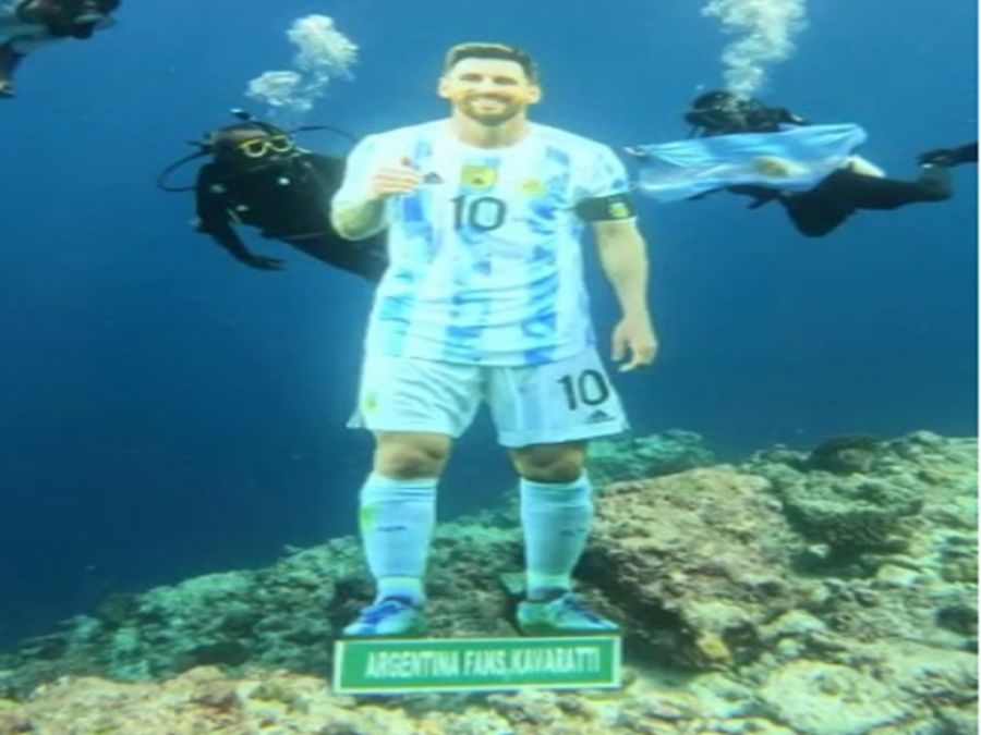 Cumpliendo con la promesa que había hecho si la Argentina llegaba a consagrarse campeón mundial de Qatar 2022, el reconocido bloguero hindú, Mohammed Swadikh, instaló una gigantografía de Lionel Messi en la profundidad del archipiélago de las Laquedivas.