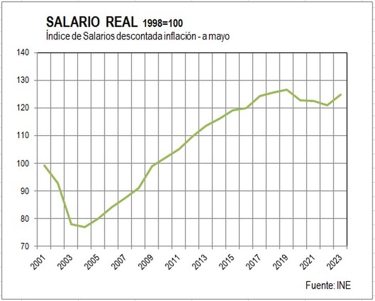 El Instituto Nacional de Estadística (INE) divulgó hoy el Índice Medio de Salarios (IMS) correspondiente al mes de mayo, que tuvo un aumento de casi 10,5% anual. Considerando que en el mismo período la inflación fue del 7,1%, el aumento del salario promedio en términos reales en el último año fue del 3,1%.