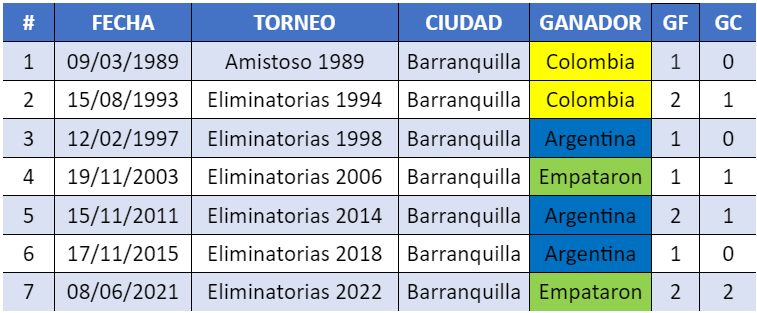 En el último choque registraron un empate 2-2, el 8 de junio de 2021 en un partido que Argentina lo ganaba 2-0 con goles de Cristian Romero (2m) y Leandro Paredes (7m), pero Colombia reaccionó y llegó al empate por Luis Muriel de penal (51m) y Miguel Borja (94m).