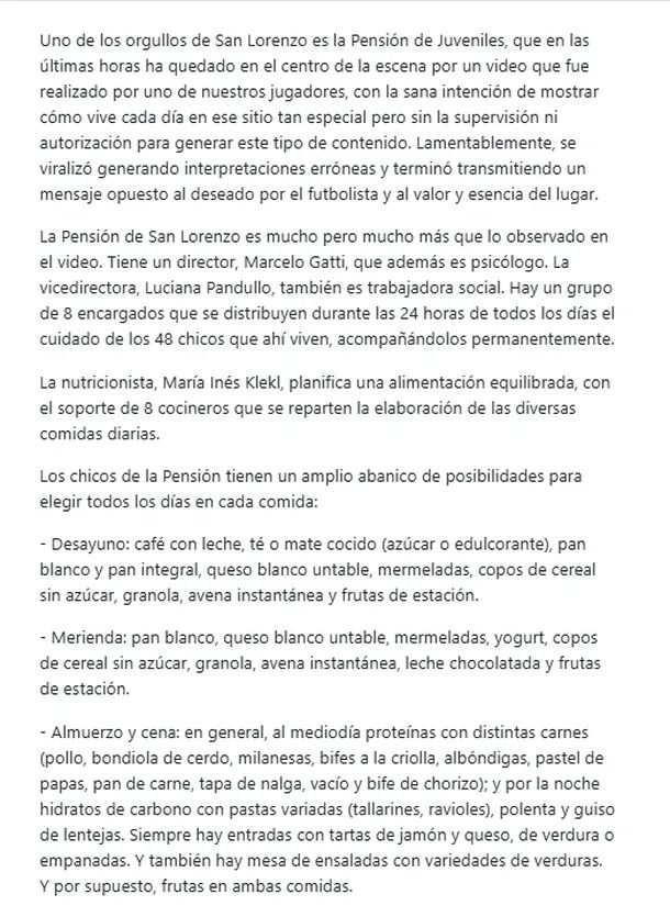 Desde la dirigencia del Ciclón aseguró que el material “proyecta una imagen opuesta a la realidad” y remarcó que fue grabado sin autorización. Según el club, actualmente viven allí 48 jugadores, bajo el cuidado de un equipo de ocho personas que se turnan las 24 horas.