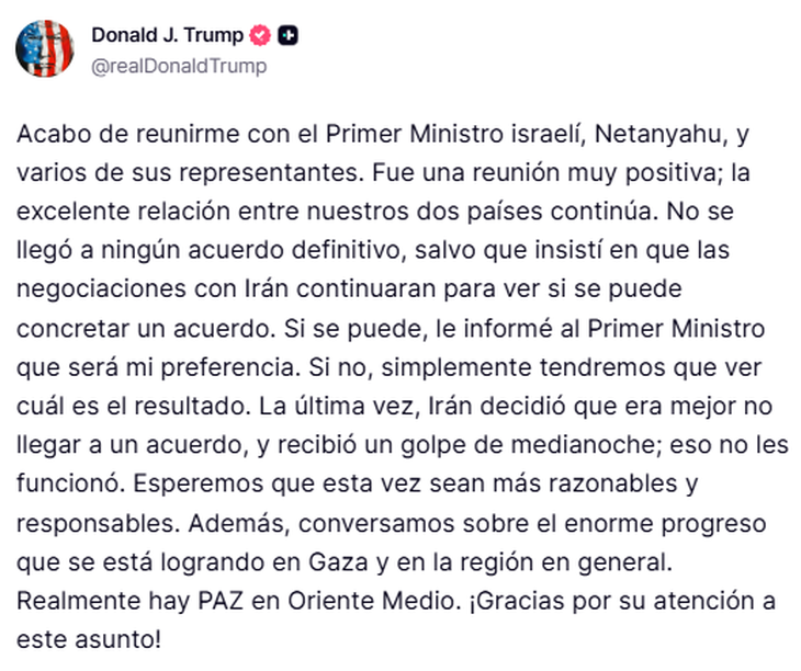 “Acabo de reunirme con el primer ministro israelí, Netanyahu, y varios de sus representantes”, publicó Trump en Truth Social. “No se llegó a nada definitivo, salvo que insistí en que las negociaciones con Irán continúen para determinar si se puede alcanzar un acuerdo”.