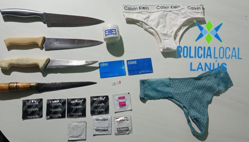 Fue detenido en una vivienda de la calle Alvear al 3400 del barrio Las Colinas, en la localidad de Monte Grande. Los efectivos secuestraron las prendas utilizadas en el hecho, armas blancas, tarjeta SUBE, teléfono celular, prendas interiores femeninas, gran cantidad de profilácticos y vaselina.