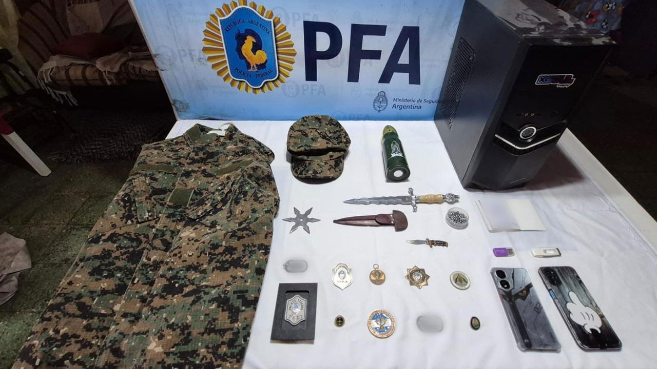 Durante el procedimiento judicial se incautaron dos dagas de uso militar; uniformes apócrifos de la Policía Federal Argentina, de la Policía Bonaerense y de la Policía de Santa Fe; una insignia del Ejército Argentino; tres chapas identificatorias con el nombre del implicado; otra con la leyenda “Campaña del servicio en Irak”; y una restante perteneciente a una comunidad de una Academia de Tiro.