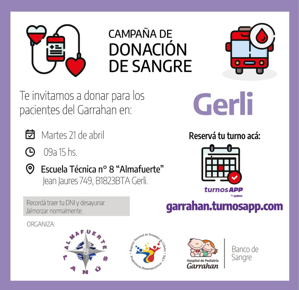El martes 21 de abril de 9 a 15, la Escuela Técnica 8 Almafuerte de Lanús, Jean Jaures 749, Gerli abre sus puertas para quieran participar de las campañas periódicas que realiza el Hospital Nacional de Pediatría Juan Garrahan para abastecer sus bancos de sangre.